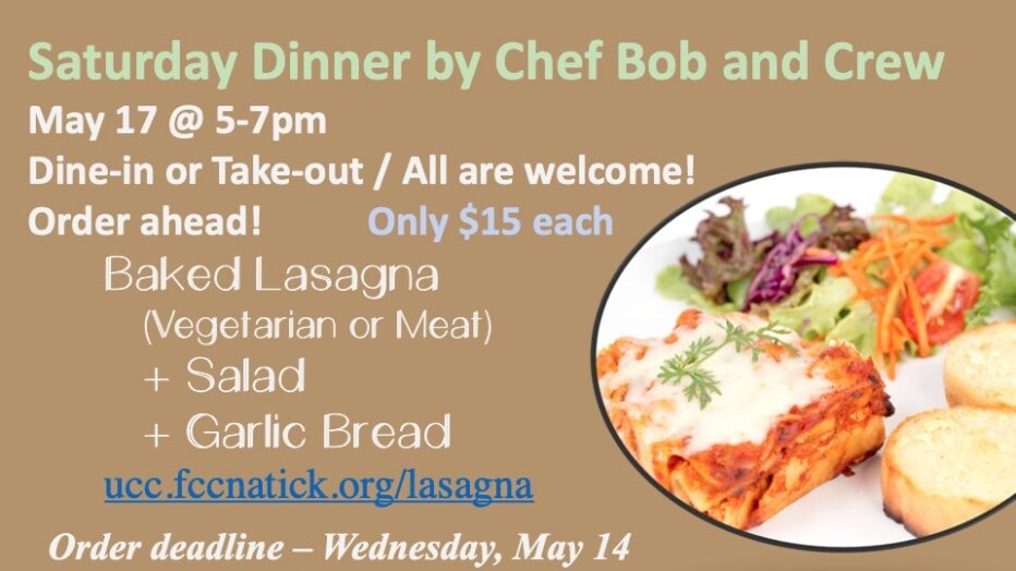 Chef Bob and the crew will be hosting an upcoming lasagna dinner. Dine-in or Take-out. Cost: $15 (vegetarian or meat; gluten free available). Menu includes salad and garlic bread. Deadline: Wed, 5/14. Place your order online: ucc.fccnatick.org/lasagna.
