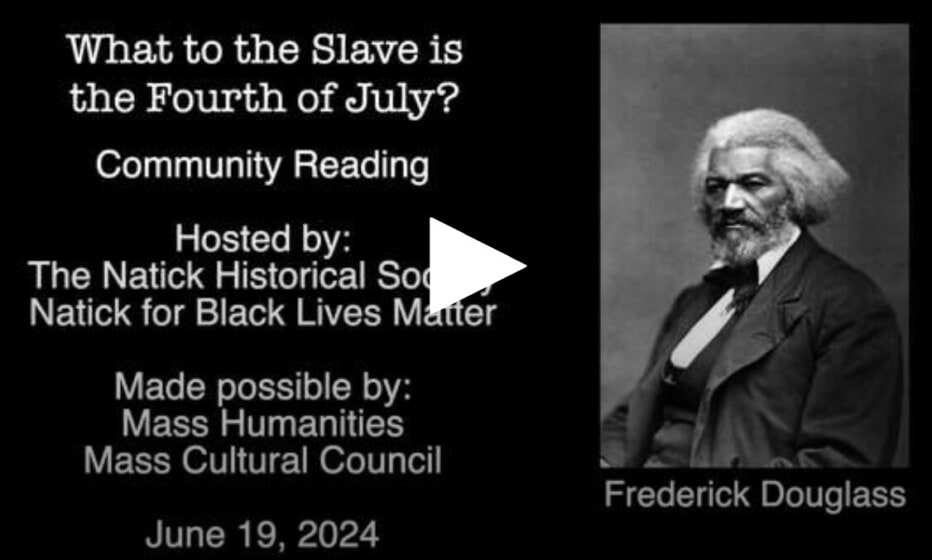 On June 19th, than two dozen Natick residents engaged in a relay-reading of Frederick Douglas’ speech “What to a Slave is the Fourth of July.” First delivered by Douglas on July 5, 1852, the speech emphasizes the brutality of slavery (which was still being practiced in the United States at the time) and the hypocrisy of a nation claiming to celebrate liberty and independence while keeping slaves. You can watch a recording of this community reading thanks to Natick Pegasus. If you do, you will see many familiar faces among the readers.